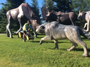 Charlie rides behind me, allowing me to set the pace. As we were nearing the top of a hill, I saw a large black shape moving up the slope. There are a lot of strawberries, itsy bitsy ones, but as sweet as candy, along the sides of the roads.  This bear was noshing on something along the roadside and retreated when it saw us. It went up a bit, then turned  around and sat looking at us. I figure it planned on going right back and finishing up as soon as we passed. I was yelling, “Charlie , look right, look right!) He missed it. Then, about 10 minutes later I saw a bear ahead of us crossing the road. When we passed it had disappeared into the bush, but there was a much smaller one that we startled on the roadside and it took off.