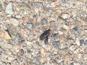 The road before us was mostly level, the only hills, long but gentle.  We set off in the still of the morning on what promised to be a lovely day, with only 10% chance of precipitation and a high of 21 degrees Celsius. Not too cold and not too hot. Sunshine! We had forgotten how nice that can be. It wasn’t long before we had to stop and peel off a layer of insulation. I, of course left my bug suit on. I’m like the “boy in a bubble” except that I’m a girl and my bubble is permeable. I do, however,  feel protected and apart from the insects when I have it on. They are everywhere and I would be constantly distressed and distracted if I didn’t have it to wear. Nobody else wears one. (Well, Charlie wore his bug pants a few days ago, but his bug top is still neatly stowed in his pannier). And people look at me a little oddly. But I don’t care. We will never see each other again.  Here is a picture of a sprucebug.    I saw it floating in the air before me and was horrified when we collided. (Probably the bug was thinking the same thing.) Anyway, I did as instructed and peeled it away from my netting by its antenna. Neither of us was the worse for wear. It layed there, stunned and traumatized as I hovered above it equally immobilized until I snapped out of it and snapped this pic.