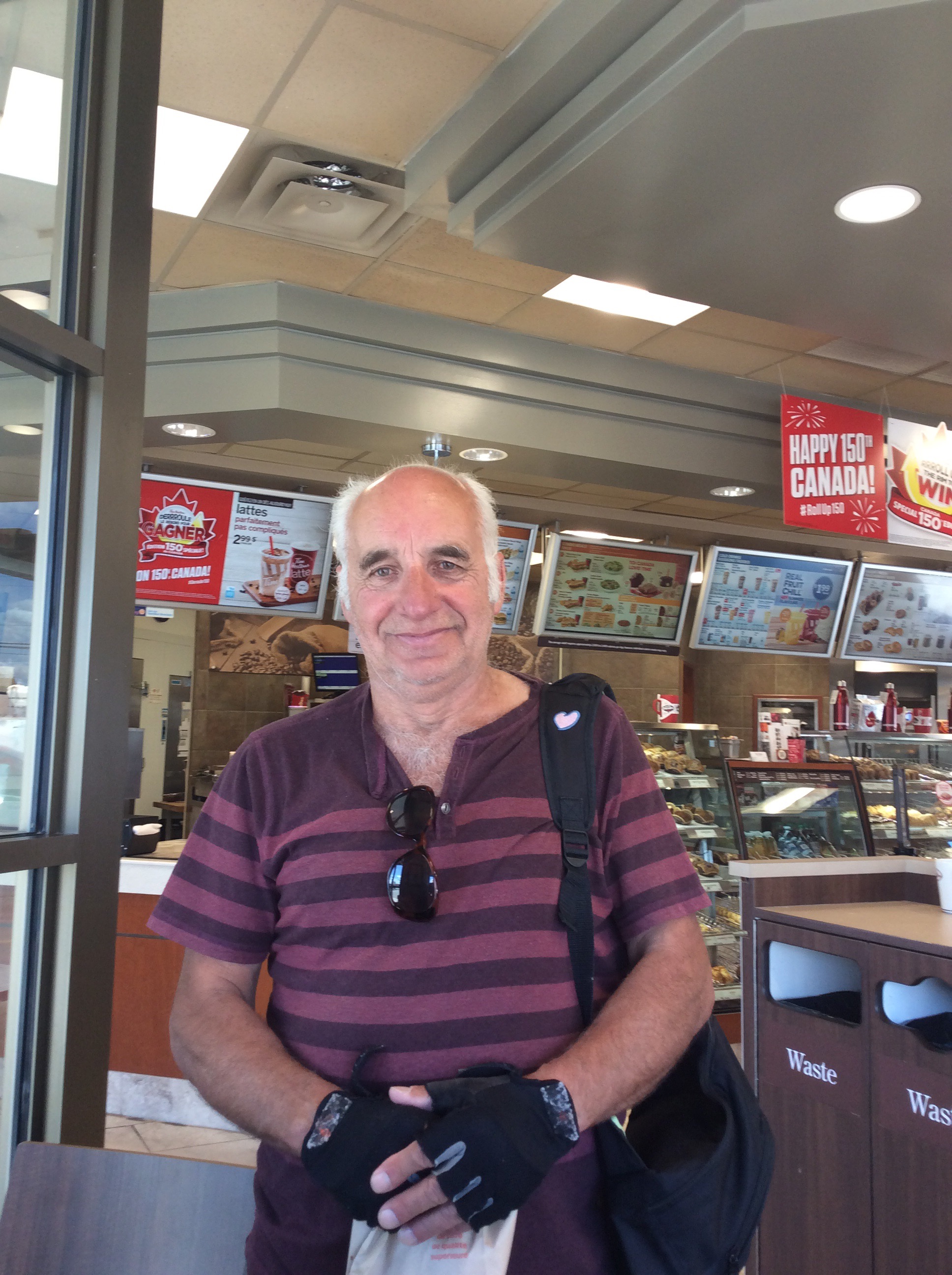 Arriving in Kapuskasing mid-afternoon gave us the chance to do one of the things we seem to be enjoying more and more often lately and that is retreating to Tim Hortons. This time we both had steeped tea and chatted with some of the  locals. We also did a bit of blogging and were totally immersed in that when a man came by. He was wearing cycling gloves and was very excited to meet fellow cyclists. He told us that he had done some very long rides, like from Kapuskasing to the Golden Gate Bridge in San Francisco and all across the deserts in the USA in the summer. He, Omer,      said he never realized at the time that he,  travelling secondary highways and thus, often isolated, could have died. He left but returned about 20 min later with some newspaper articles he had photocopied for us. On his return from one of his long solo cycling trips where he rode for 15 hours a day, ate one meal and slept in a hammock, the local newspaper had interviewed him.  There are several other articles as well. We haven’t read them yet in full but we look forward to doing so.