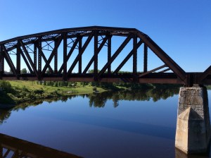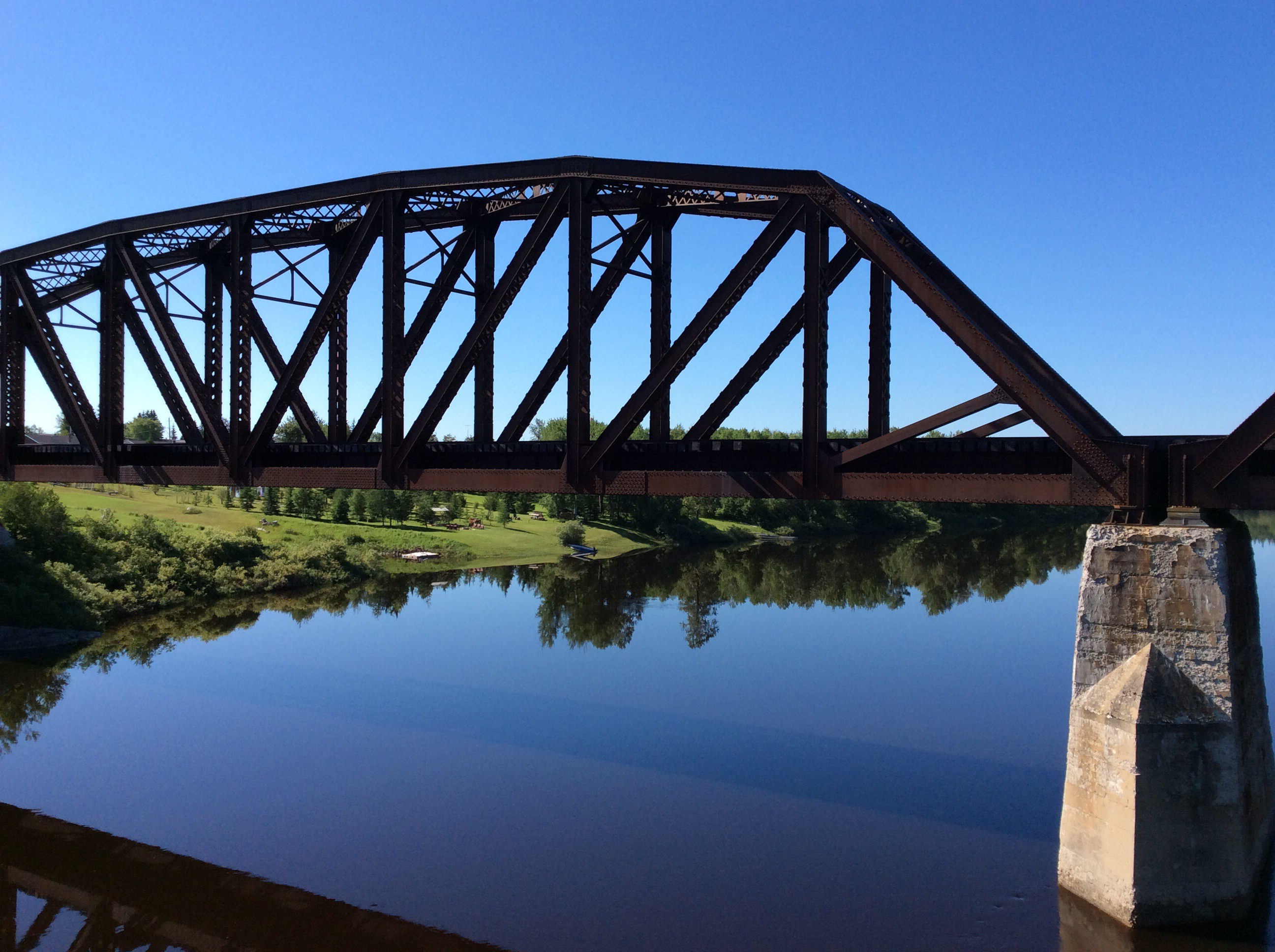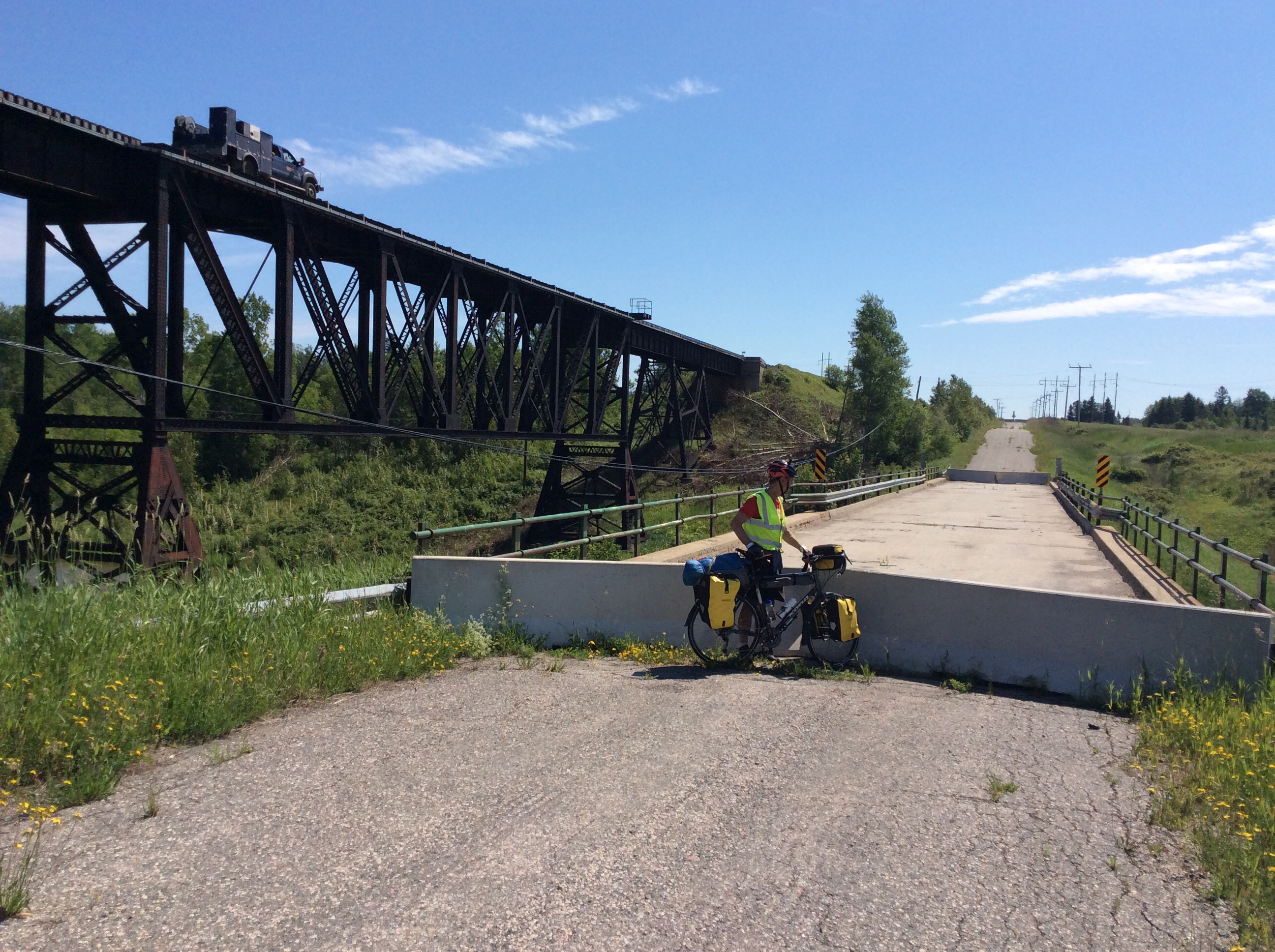 This was what riding should be like! Once on the secondary roads we started to realize how stressful it had been on the main highway. Traffic was light, we had many stretches where we could ride side by side. Near Monteith, under the shadow of the correctional institute, we had to lift our bikes over 2 barriers and cross over an abandoned bridge.   Agriculture is returning to this region as some of the Mennonites from Elmira have come north, bought up vast quantities of land and are expanding their colonies.     The people welcome their presence and industry as Iroquois Falls has lost their main industry, pulp and paper recently.