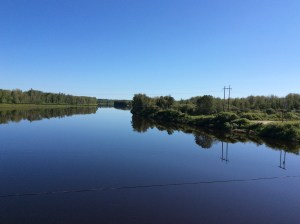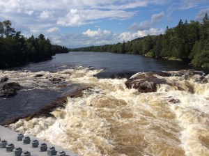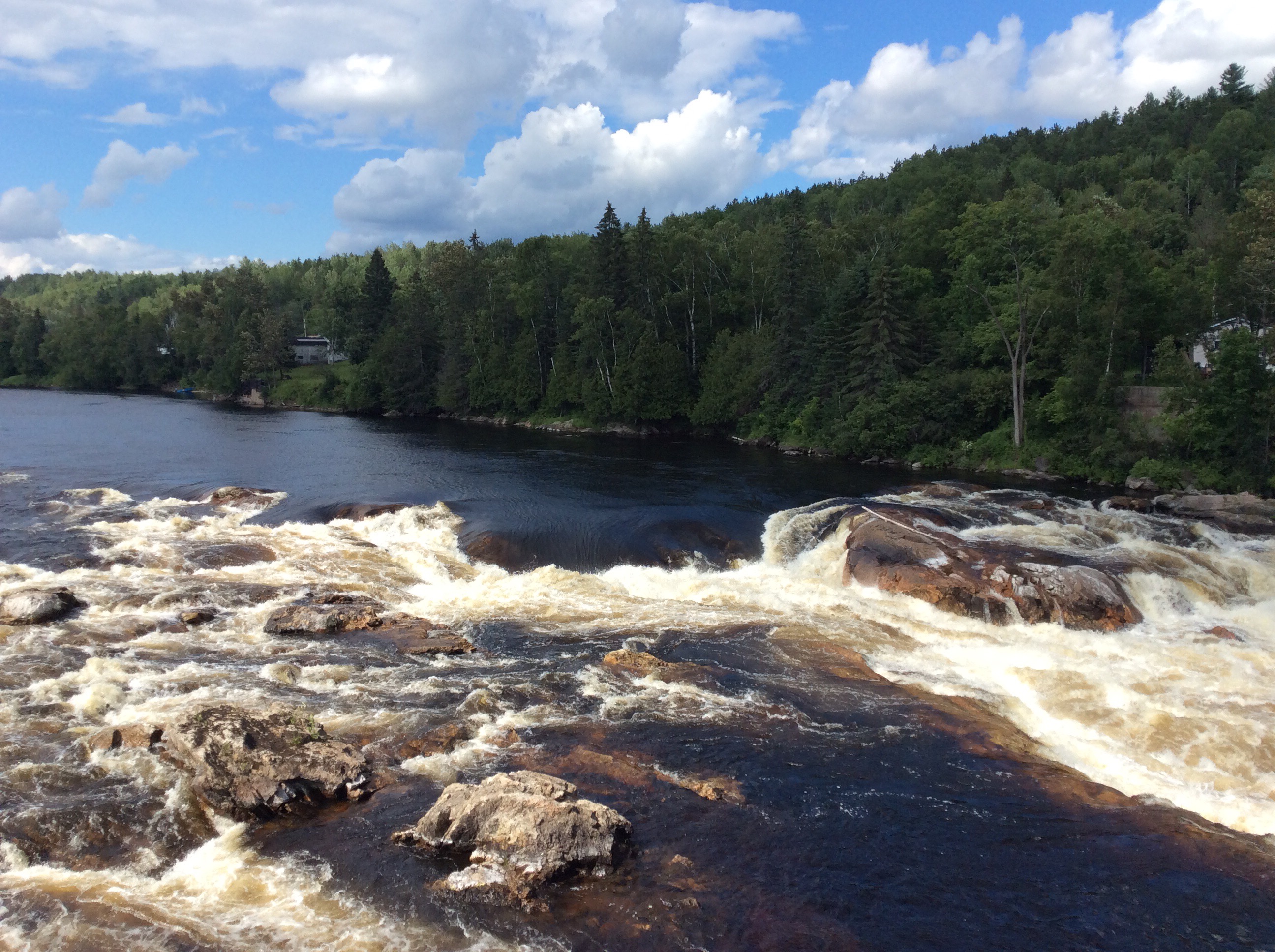 There was no need to wear “my uniform” of merino wool this fine sunny morning. Neither did I  need the bug suit. It was beautiful, with almost perfect conditions.   La Route Verte 2 on highway 117 has good shoulders and fairly good pavement. It was just when we turned onto highway 105 at Grand Remous that we hit terrible tarmack. We stopped there at a depanneur , bought chocolate milk and made ourselves some bagels with cheese, before proceeding on our way. There are waterfalls there worth a stop. Mesmerizing watching all that water flow…. Where does it all come from? Won’t it run out sometime?