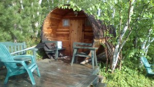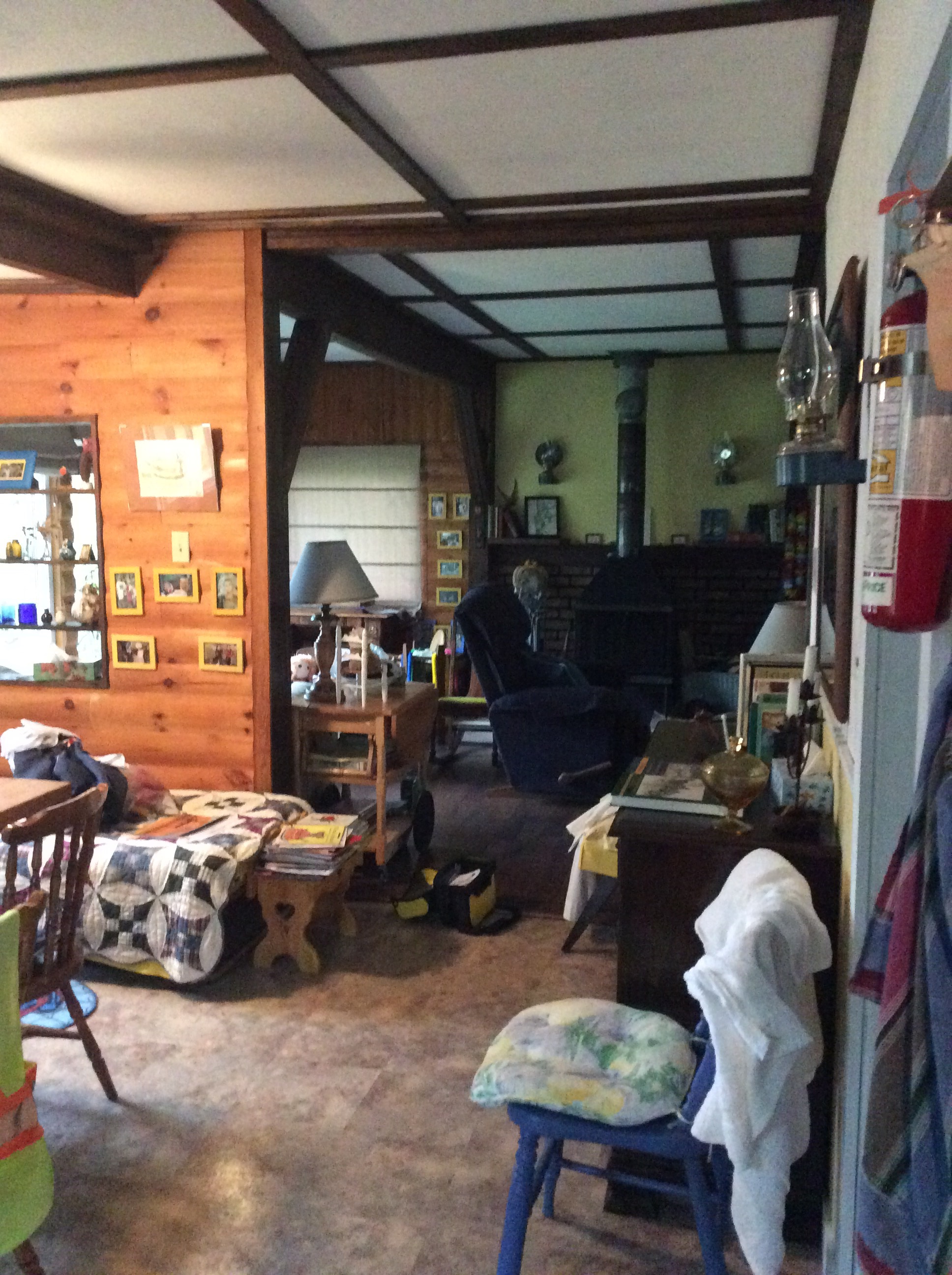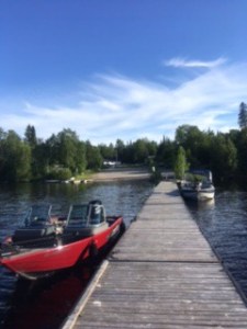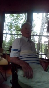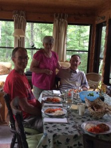 Marilyn and Chick met us on the lawn, undoubtedly wondering why we were arriving by truck.  The neighbors, both long residents of the area, had never met each other but had friends in common and were happy to meet each other. Our hosts gave us a tour of their property, including the lovely little cabin we were to stay in. They were having problems with their water supply so we went for a refreshing swim in the lake with a bar of soap, followed by about 20 minutes in the sauna and another dip to rinse off. We dressed and went to the house where Marilynn had prepared dinner for us all. Salad, rice, carrots, chicken and rhubarb cake.  Nice evening. Awesome hosts! They have a large family with 7 grandkids, (a dearly loved grandson and twin, Danny Wilson, had died 6 years ago in an unexplainable car accident.)  They mourn him still, of course.  All of them love to visit Grandma and Grandpa at the lake. The cabins and their main house is full of family pictures and kid’s drawings, knick -knacks and family treasures. You can feel the warmth, the love there. And they treated us just like family. Such surprises. We are aware and appreciative of all the blessings that keep coming our way. Thank you Marilyn and Chick!! And thank you Judy!