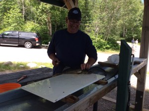 This park and beyond, has a multitude of lakes, rivers and streams, and they are all teeming with fish. Everyone here, everyone, loves to, lives to hunt and fish. People come out with their RVs and boats and pretty well make a summer of it. If they’re working, many will leave their equipment right at their sites and come up every weekend. The catch of the day is dore, (pronounced dooray), otherwise known as Walleye. I’ve never tried it but all we’ve talked with assure us that it is the best tasting fish there is. This man was cleaning his fish    and he explained that they could not be less than 37cm or bigger than 53cm, and he showed us how he did them. The limit is 6 fish per person. Now if you fish your quota today and eat all 6 tonight, tomorrow you can fish for 6 more. Apparently the natural resources wardens are authorized to go to a persons home and check their freezers to make sure they haven’t stockpiled fish.