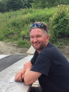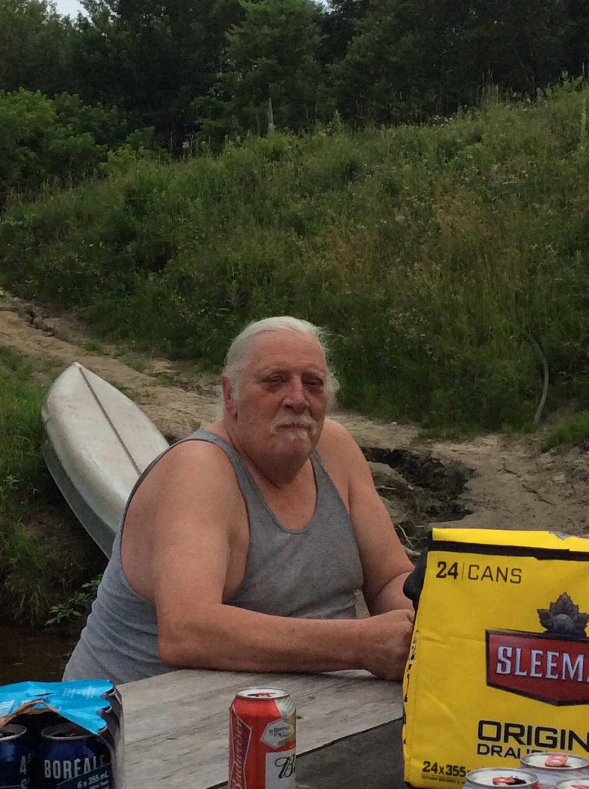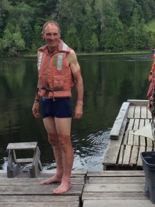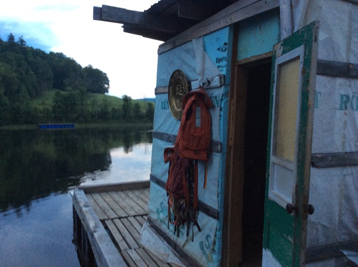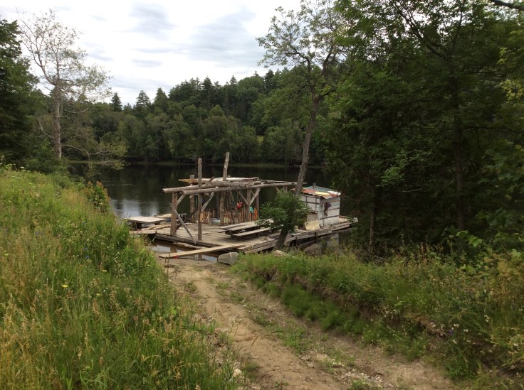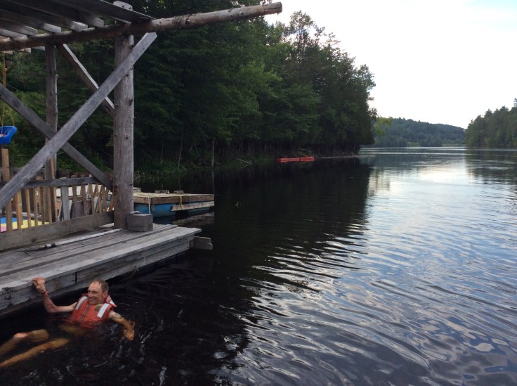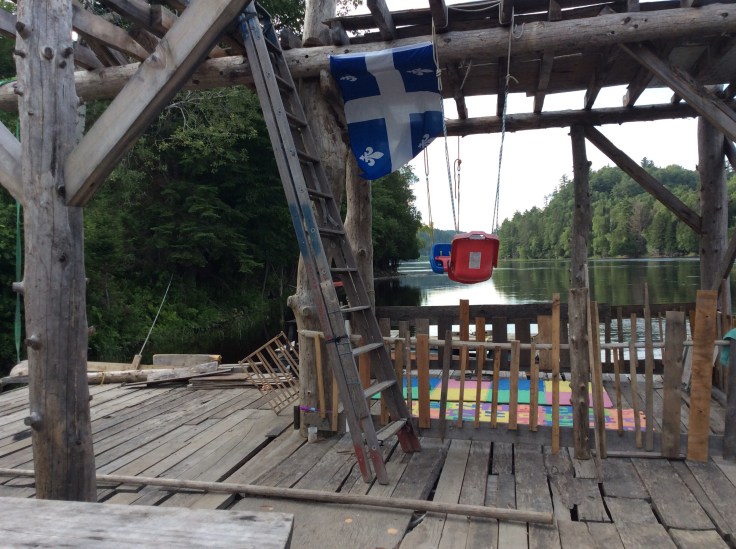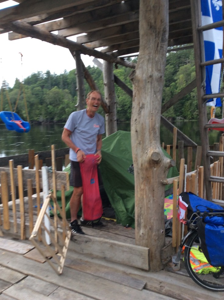 This raft was a raft like none other! It had a 20′ foot table with benches, a sauna, a piano, a sectioned off area for little ones with an interlocking rubber floor mat, swings, a BBQ, a Quebec flag and an upper deck. I asked Phil if we might be able to put our tent up in the kids area and he said, “Why not!” So that’s what we did!    No snakes there! Phil and another local guy, Dave,     who happened by, visited with us for a couple of hours, telling us all kinds of stories about another guy, Dennis. Dennis is a Ryan, and it’s the Ryan family that owns this piece of property upon which we were about to set up camp. He sounds like quite the character! He often goes to the raft in the middle of the night and plays the piano. Another story is that he was in the psych ward of a nearby hospital. He broke out of it, went around to the entrance and told the staff there that he was there to see his brother, giving his own name, Dennis Ryan. Apparently he just sat there and waited as all hell broke out as they searched for “his brother”.