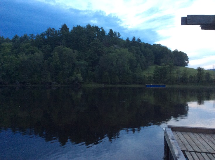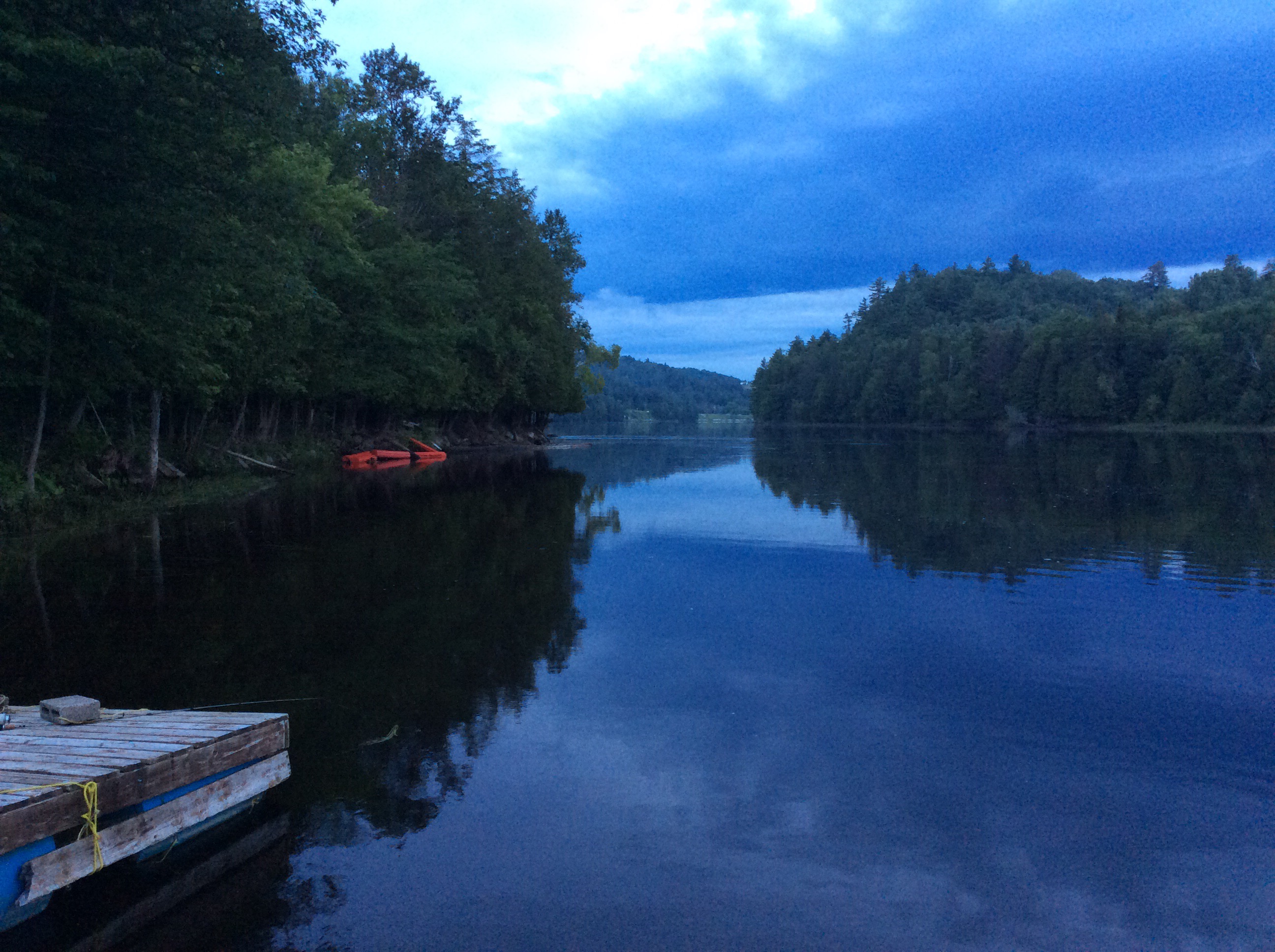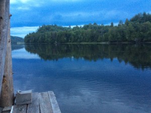 The Gatineau River, at least where we were, is as calm as calm can be. When you look across it’s mirror surface, it is unbroken save for the multitudes of water insects living dangerously atop its surface. They skim across leaving little v-shaped wakes behind them.  Every few minutes there is a big splash and some of them disappear. Apparently the fishing is excellent around here.