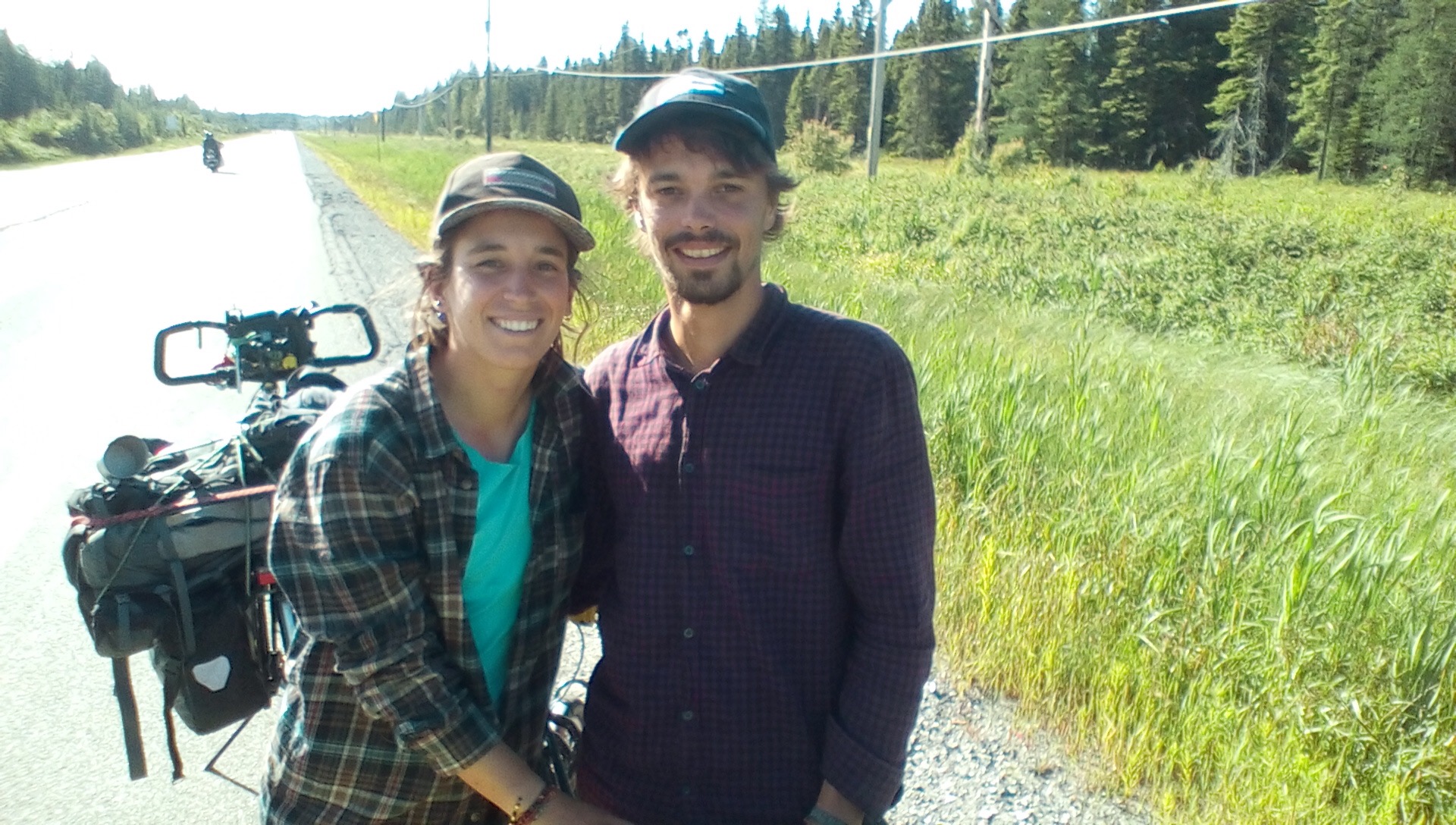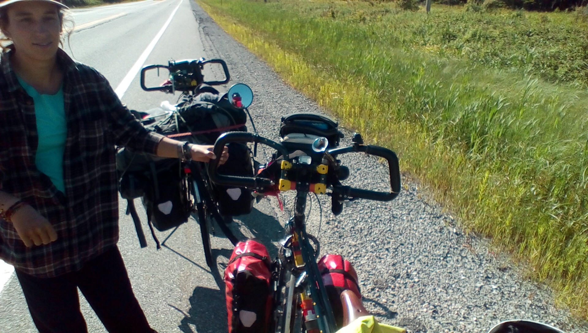 Back on the road we met some other cyclists, Deni and Letitia,  from Switzerland. They had been cycling for 10 months and had covered France, Spain, Cuba ( for two months)  and were now cycling Montreal to Vancouver. Letitia’s left knee had been hurting her for 3 days and they had rigged up a system where they had attached their long strong chain locks together and had rigged it so that Deni was actually towing her rack to rack. For three days he had been towing her. She did what she could with her right leg. There were so many hills! It must have been crazy hard! We chatted for a good while and invited them to come stay with us when (if) they get to Calgary if we’re home. They were headed to a “Warm Showers” home in  Val D’Or and planned on taking a few days to rest. Bonne chance Letitia et Deni!                       (I have handlebar envy!)
