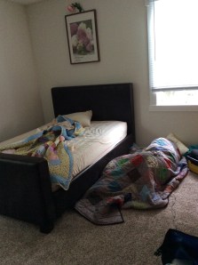 I ended up getting it to myself because it has a headboard and a footboard and Charlie can’t stretch his 6’4″ frame all the way out. He briefly considered lying across the bed but I figure that if you can’t stop growing when you’ve reached a reasonable rate already……. then too bad for you! Charlie ended up on the floor and was comfortable there too. I got the bed! We slept. And slept. Way past the 4:30 we’ve been getting up at these days. Then around 9am I read a bit of “The Girl on the Train” on my iPad. Charlie had an appointment for a blood test and had slipped out earlier.